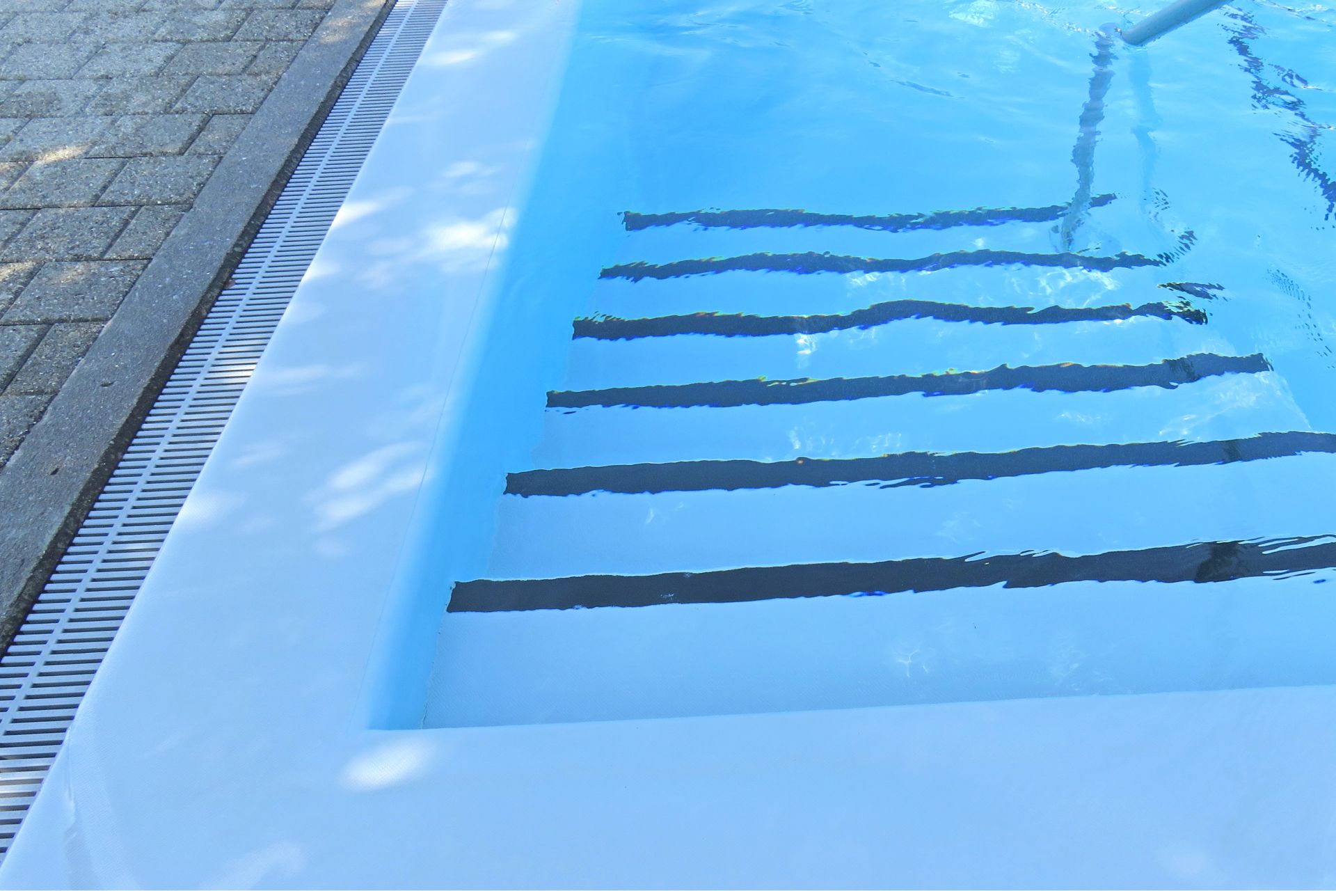 Das schwimbecken wurde mit Sikaplan®WP 3150-16 ausgekleidet, einer kunststof dichtungsbahn mit Polyester-Gittergewebe auf Basis von Weich-PVC。1.6毫米的板条和布条,在布条的范围内。法布瓦尔städtischen体育委员会在mittelgrau,韦尔萨尔在sonnenestrahine natürliche,蓝色法布瓦尔。