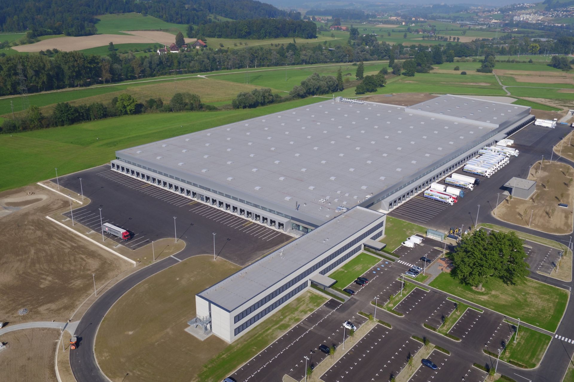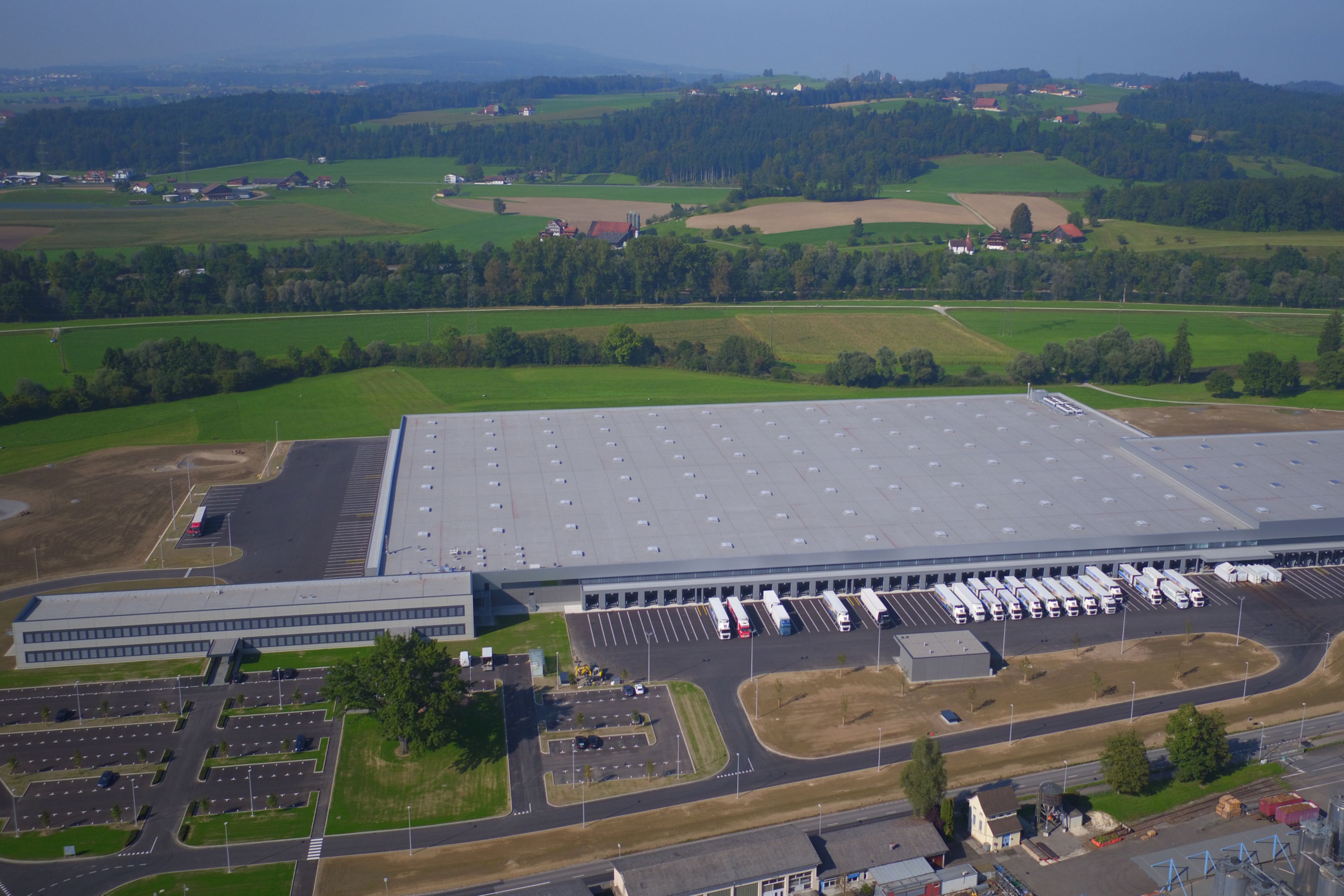 在Perlen Isteine der Modernsten und Nachhaltigsten Logistikzentren der Schweiz entstanden。Rund 160 Mitarbeitende des Schweizer折扣员Aldi Suisse AG Habben 2016 Den Operativen Betrieb Aufgenoman。Zum Verteilzentrumgehörennebst einemverwaltungsgebäudeauchein trockenlager sowie eintiefkühlzentrum - 麻省理工学员einer gesamtendachflächevon rund 50'000 m2。